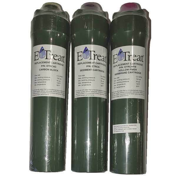 E-Treat Replacement 3 Water Filter Kit offers all three E- Treat filters (1) ETRCAC (1) ETRCS (1) ETRCHFM cartridge in one simple kit. Toboa Energy provides the best OEM and replacement choice for your most important asset, clean, safe, sediment free water.