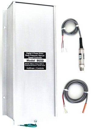 The Hoffman Controls 865D-HP Pressure Controller three phase head pressure control monitors the head pressure by sensing excessive liquid sub cooling and modulates the condenser fan motor speed and varies the volume of air through the condenser. Each application requires the controller be installed as a package with an approved motor. The 865D is a direct replacement for the obsolete 865-3AA.