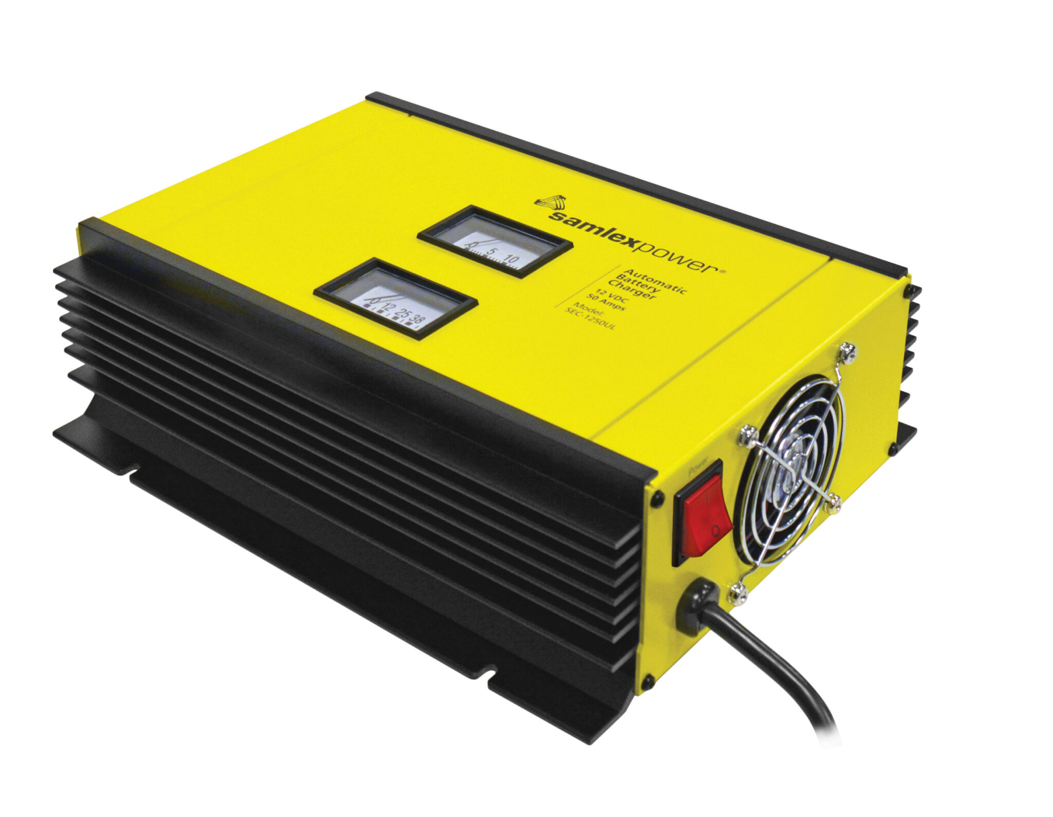 Samlex SEC-1250UL Battery Charger 50A 3-bank 3-stage 12vDC,115/230v is an advanced fully automatic three-stage 50 Amp battery charger is ideal for charging all types of 12 Volt lead-acid batteries ( Flooded / Absorbed Glass Mat (AGM) / Gel Cell) from a 120 V, 60 Hz or 230 V, 50 Hz AC source. By means of a DIP switch setting, conversion to a two-stage algorithm is possible to charge batteries connected to a DC load (DC UPS). The unit can also be used as a DC Power Supply. Samlex SEC-1250UL Battery Charger features include overload, short-circuit and over-temperature protection. The unit allows charging of up-to 2 separate battery banks.