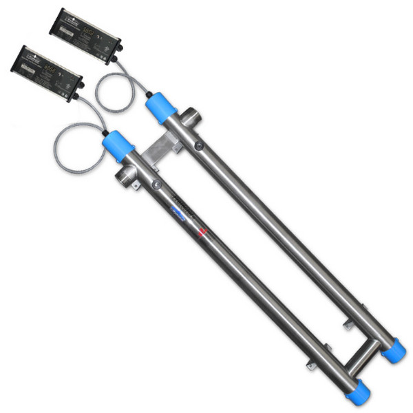 The Wyckomar UV-5000 Ultra Violet Water Sterilizer 87 gpm 120vAC is a robust, high quality ultra violet water sterilizer that provides very efficient treatment at a low cost per unit volume. Typically installed at the point of entry, it can treat municipal water as well as ground water from drilled or dug wells, and surface water from lakes, ponds or rivers (pre-filtration necessary). This sterilizer is perfectly sized to provide drinking water or purified process water for commercial and light industrial applications, including food and beverage processing, pharmaceutical manufacturing, or cooling towers. It is also a very popular system for the disinfection of pools and spa’s. The UV-5000 contains two low-pressure, high output UV lamps in a manifolded 316L stainless steel reaction chamber. It comes with two electronic ballasts that feature a lamp-out alarm if there is no power to the lamp.